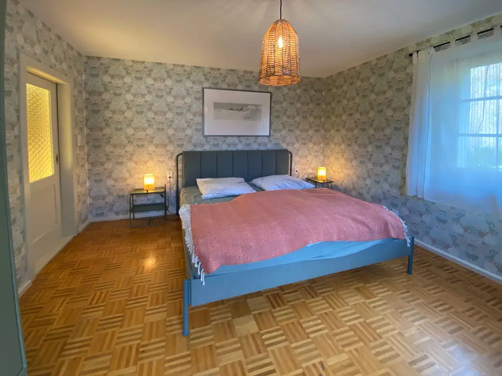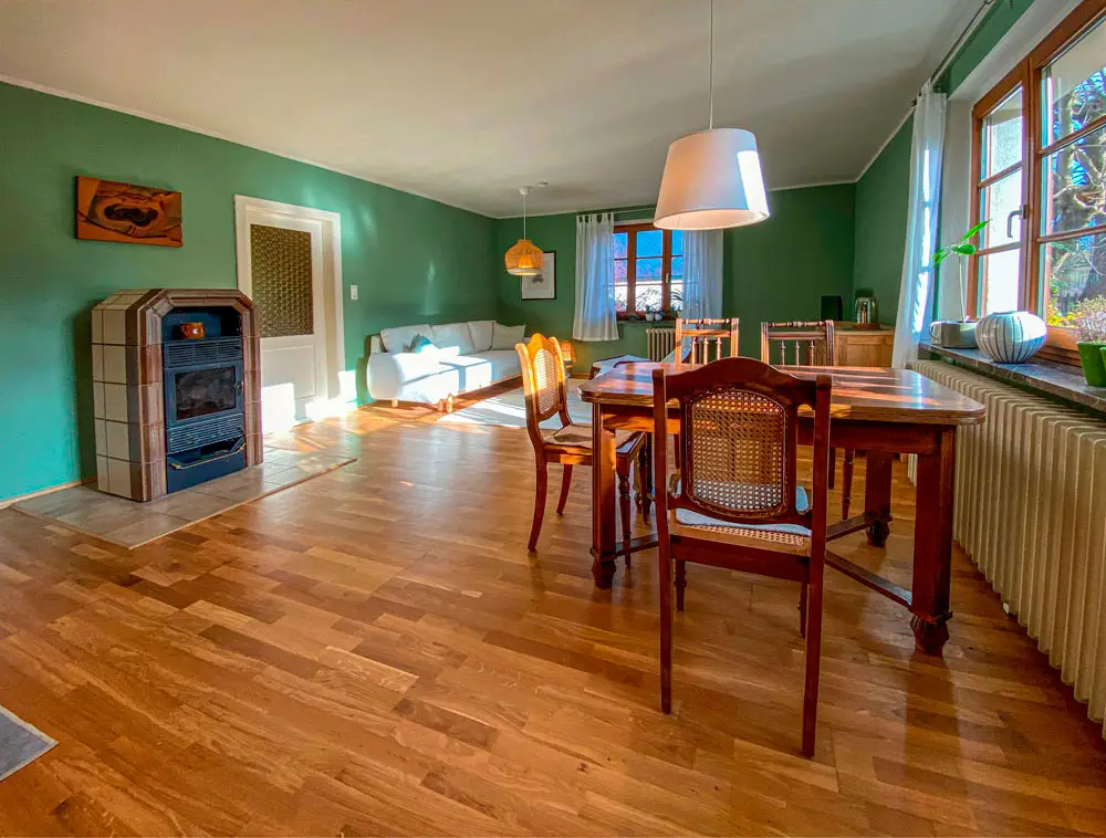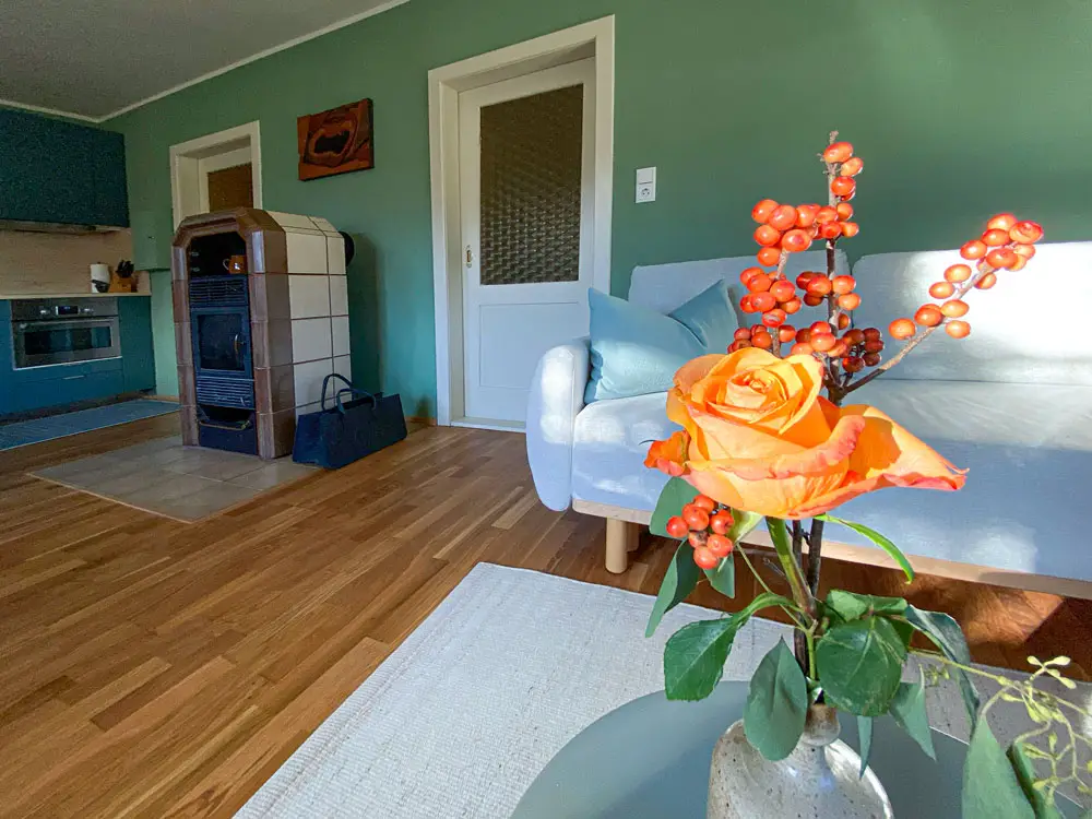 Die barrierefreie Wohnung im Erdgeschoss des Wohnhauses von Andrea und Rainer Marofke verbindet den Charme eines älteren Hauses mit modernem Wohnkomfort. Die großen Fenster lassen das Licht in das geräumige Wohnzimmer scheinen. Wer gern kocht, kann an der modernen Küchenzeile seine Lieblingsspeise bereiten. Im Kühlschrank kalte Getränke. Das Bad mit Zirbenholzsauna wird ihre Wellness-Oase. Nach der Sauna im Sessel vor dem Holzofen-Feuer entspannen. Am Morgen durch das Licht der Sonne und Vogelgezwitscher geweckt. Zeit für Kaffee. Doch zuerst ein Spaziergang durch den Künstlergarten. Einmal um den Teich. Die frische Morgenluft tief einatmen. Dann unter der Rosen-Pergola frühstücken. Die Nachbarskatze schleicht vorbei. Ein Eichhörnchen balanciert vielleicht über den Zaun. Das Leben kann so einfach und schön sein!