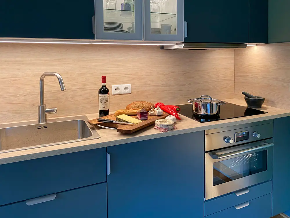 Induktionsherd mit Dunstabzugshaube, Backofen, Mikrowelle, Kühlschrank mit Gefrierfach, gute Ausstattung mit Kochgeschirr, Speiseservice, Gläsern, French-Press-Kaffeekanne u.v.m.