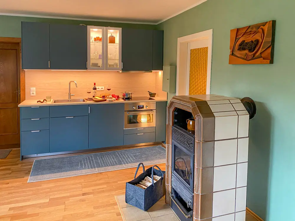 mit Küchenzeile und Esstisch, Couch (ausziehbar als Schlafcouch), Holzofen, WLAN/TV, Größe 34 qm